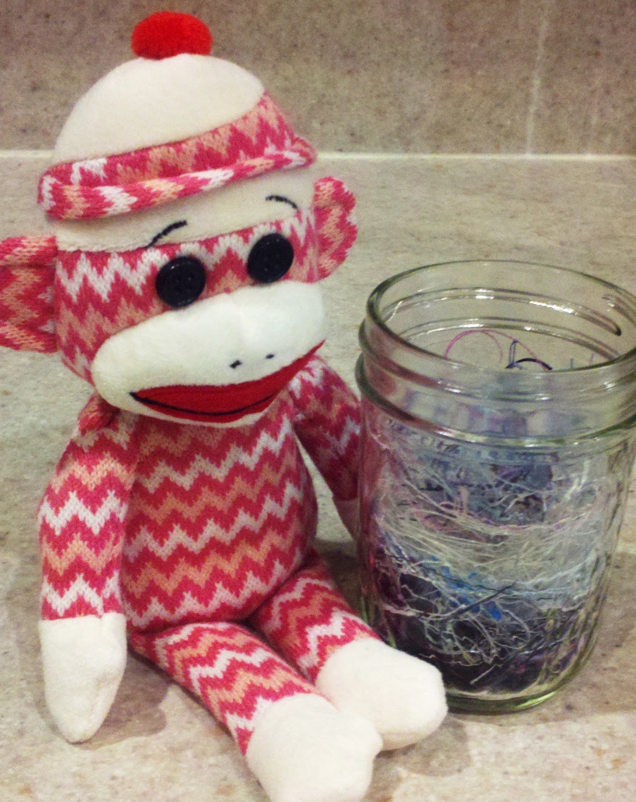 Sitting with my Valentine Sock Monkey :)   I layered on top of what I completed for January....but I'm thinking I'll transfer these to a larger container and start fresh for the next update!